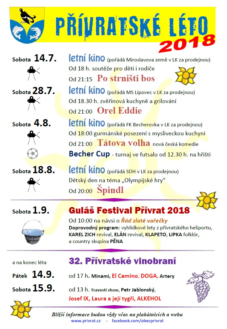 32. Přívratské vinobraní pátek od 17 hodin na návsi koncert skupin: Minami, El Camino, DOGA + zábava Artery sobota od 13 hodin na návsi: Petr Jablonský, Josef IX, Laura a její tygři, ALKEHOL večer na sále bál Po oba dny odrůdová bílá i červená vína, burčák, křapáče, kuřata na roštu, uzené klobásy. Pro děti kolotoč, houpačky, střelnice. V případě nepřízně počasí je areál zastřešen. Na shledanou se těší přívratští hasiči!