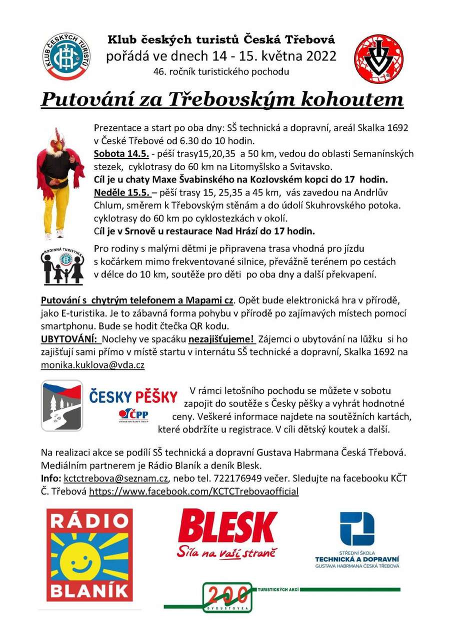 Klub českých turistů Česká Třebová Vám nabízí možnost aktivně stráveného dne na turistické akci „PUTOVÁNÍ ZA TŘEBOVSKÝM KOHOUTEM“. Připraveny jsou trasy různých náročností a délek, jak pro rodiny s dětmi nebo kočárky, pěší turisty v délkách 15 až 50 km, a cyklisty v délkách do 60 km. Podrobnosti naleznete v přiloženém letáku.