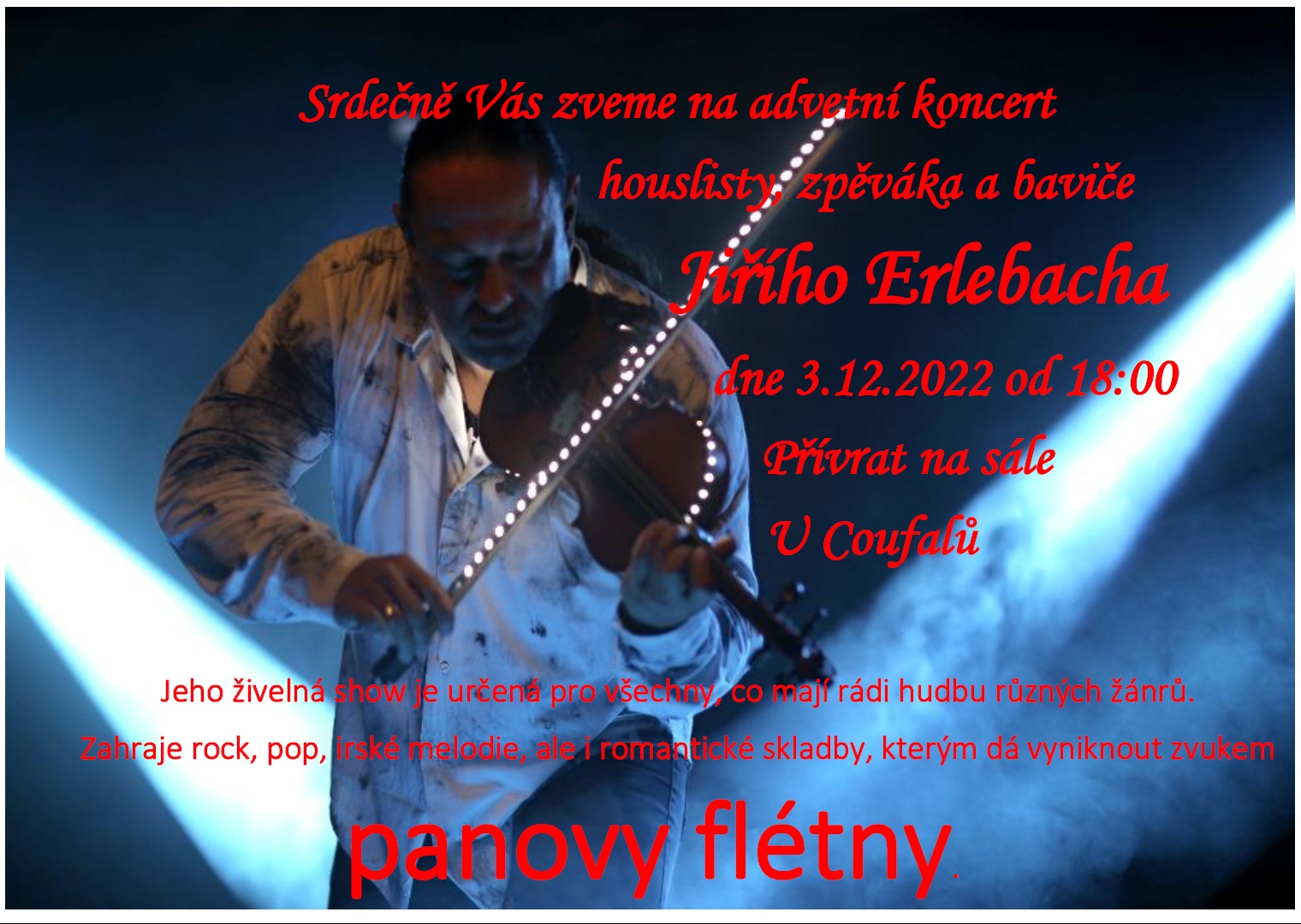 Zahraje rock, pop, irské melodie, ale i romantické skladby, kterým dá vyniknout zvukem panovy flétny.
